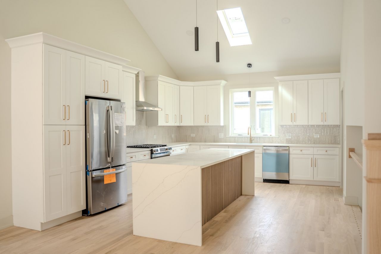New custom-built 5-bedroom, 3-bath split-level featuring 20-foot vaulted ceilings and oak hardwood floors. The open-concept main level includes a kitchen with an oversized island, stainless appliances, and skylights, with direct access to the backyard. The layout offers versatility with a main-level bedroom/office and a lower-level guest suite with a private full bath. The lower-level family room includes a floor-to-ceiling fireplace and custom built-in cabinets. Additional features: Side-by-side laundry room with sink and cabinets. Full basement with 8 foot ceilings. 3-car garage. Home also comes with pre-installed, hardwired security cameras